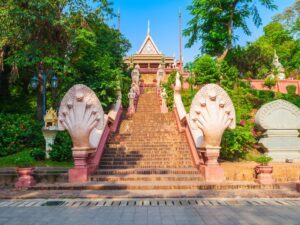 Visitors can climb the hill via stone steps to the main hall to worship Buddha and learn about the legend of the noblewoman Penh. The sacred space combined with the green landscape creates a sense of serenity.